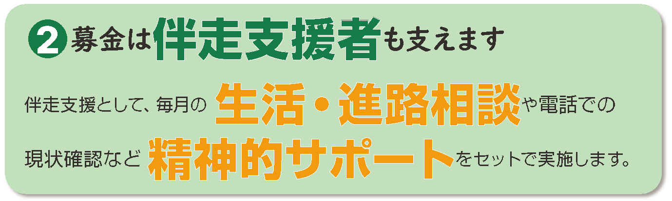 目指している姿は、単なる奨学金給付にとどまらない奨学生に寄り添った「伴走支援」。社会的経験の少ない奨学生に対して、定期的な生活・進路相談などの精神的サポートを行うことで、将来的な自立に向けた支援をします。