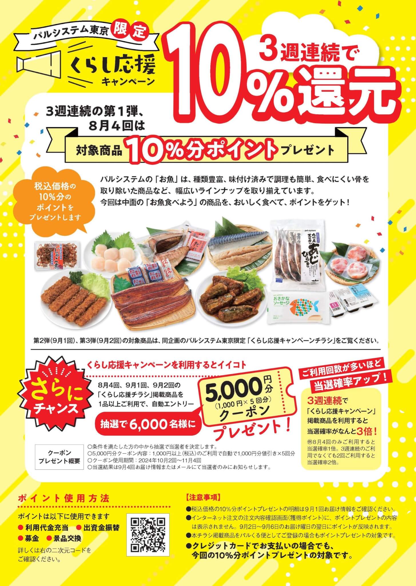 ※税込価格の10%分ポイントプレゼントの明細は9月1回お届け情報をご確認ください。※インターネット注文の注文内容確認画面(獲得ポイント)に、ポイントプレゼントの内容は表示されません。9月2日~9月6日のお届け曜日の翌日にポイントが反映されます。※10%還元チラシ掲載商品をパルくる便としてご登録の場合もポイントプレゼントの対象です。※クレジットカードでお支払いの場合でも、今回の10%分のポイントプレゼントの対象です。※第2弾(9月1回)、第3弾(9月2回)の対象商品は、同企画のパルシステム東京限定「くらし応援キャンペーンチラシ」をご覧ください。