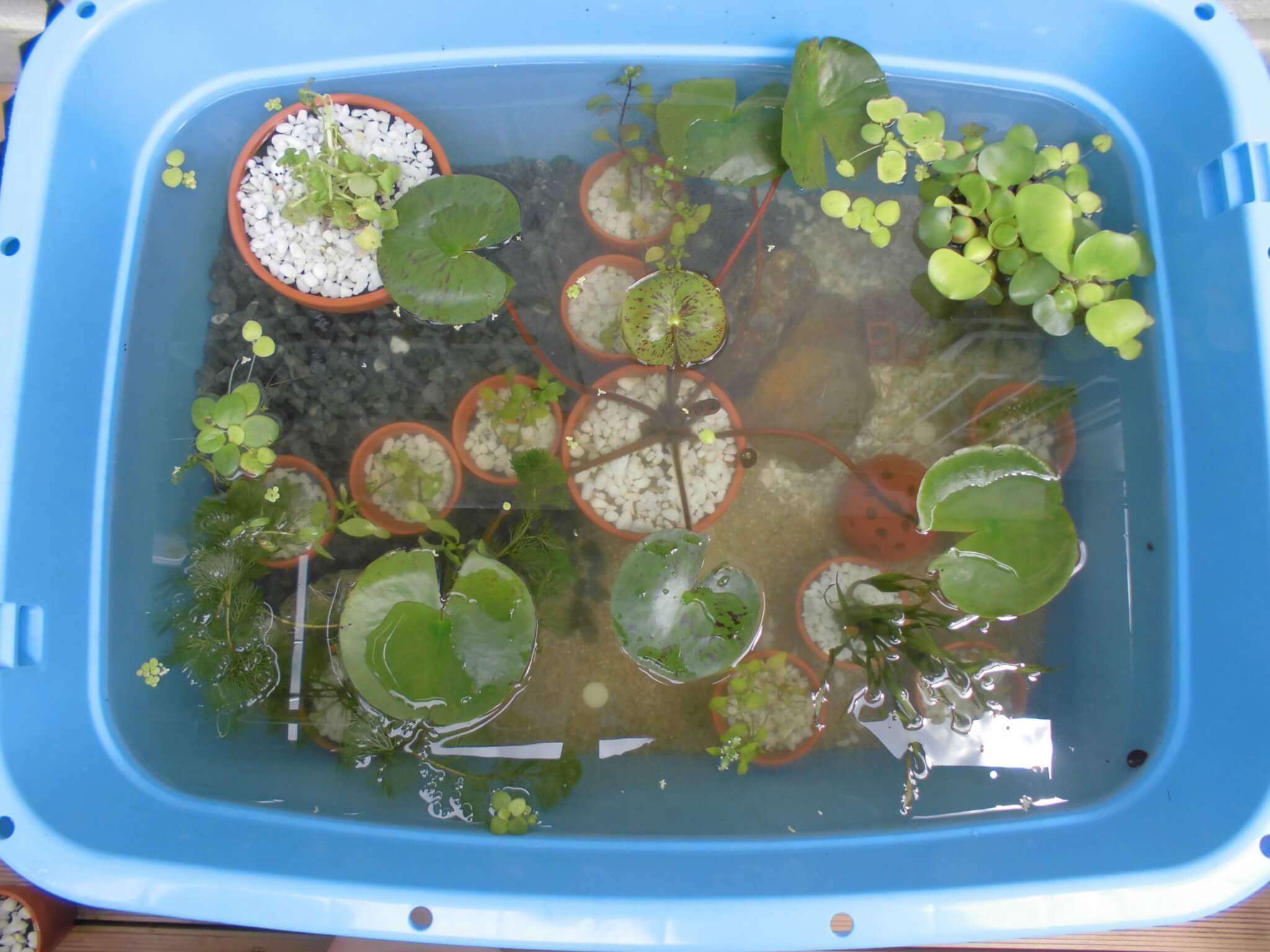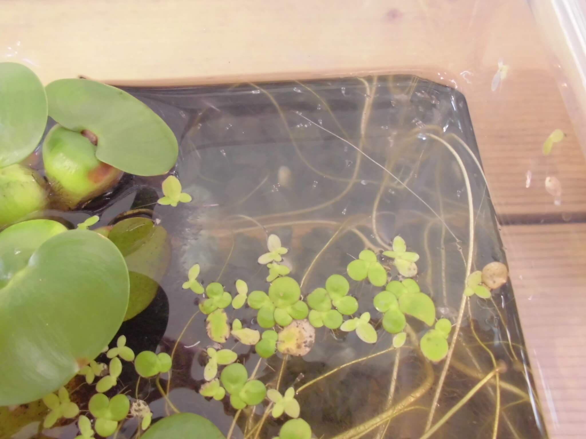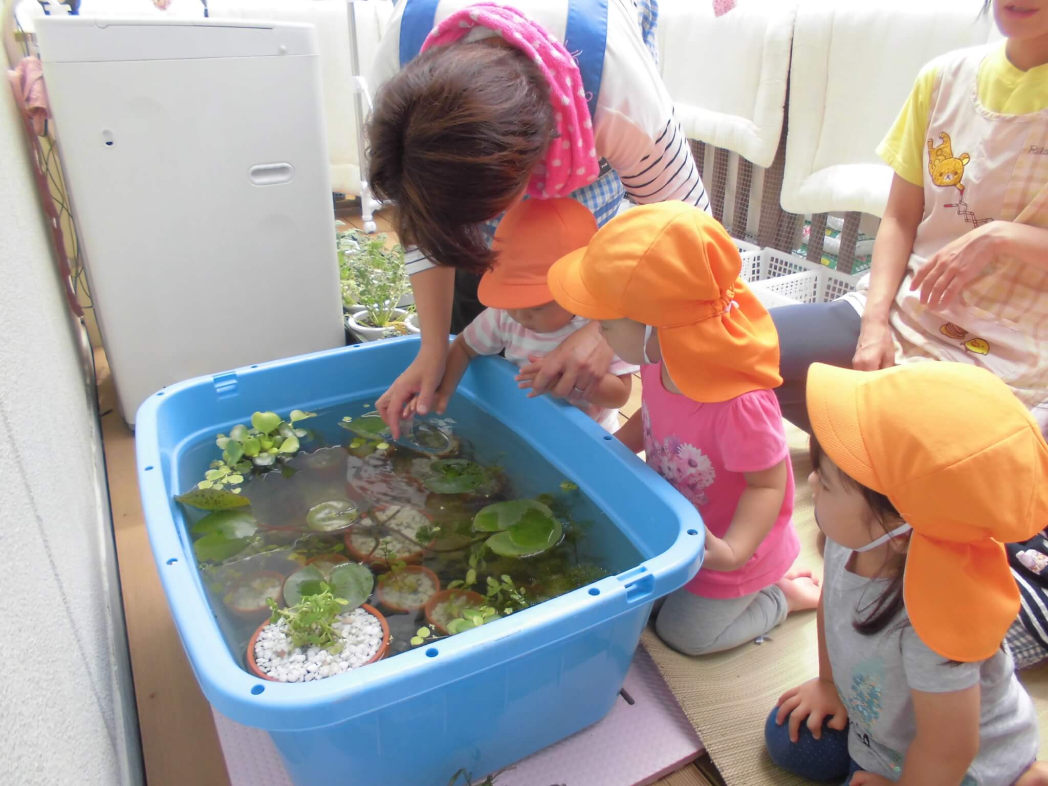 “こんなに卵がついていたとは!!”と職員一同ビックリするくらいのメダカが孵ったこともあり、いよいよ、子どもたちと一緒にメダカを大きなお家にお引越し。これなら、たくさん泳げるねー!!