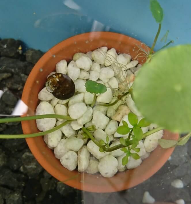 ▲7/25 エビも仲間入り。ビオトープ内のコケなどを 食べてくれるお掃除担当♪