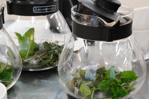 スペアミント、アップルミント、レモングラスを使ったミントティーで、参加者のみなさんをおもてなし。「ミントティーは水分補給としてもいいし、暑いときに飲むとすっきりします。リラックス効果もあると言われています。」と講師の小下さん。会場に着いてすぐ講座を始めて調理して・・・というのではなく、お茶を飲むことでリラックスをしてから始めるのも、食育リーダーの細やかな気遣いのひとつです