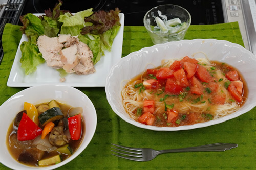 当日のメニュー:和風冷製パスタ、蒸し鶏のスライス、ラタトゥイユ、ヨーグルトの即席漬け