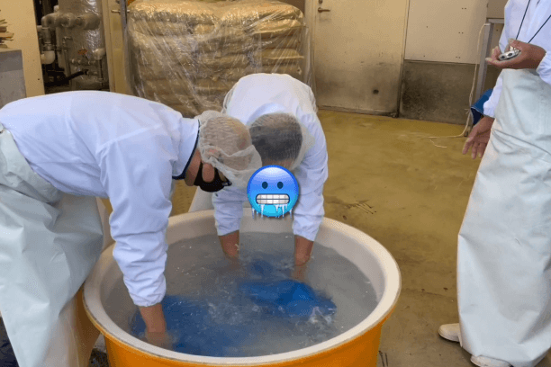 11月のため、まだ極寒とまではいかないまでも、そこは上越。やはり厳しい寒さと、洗米に使用する地下水の冷たさは、真冬そのもの。10㎏の重さの米を手が凍り付く冷たさの地下水で洗う作業は口では言い表せない大変さがあります。
