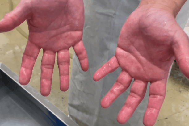 洗米後の手。真っ赤です。