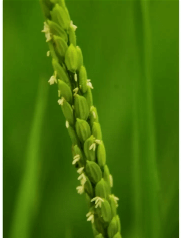 これは、お米の「お花」だよ。とても小さく葉の中に隠れるように咲くため、農家さんもなかなか見ることができない、貴重なお米のお花なんだよ。