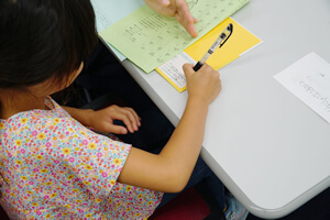 遠いアジアの子どもたちが読む絵本だと思うと、シールを切って、絵本に貼る作業も真剣です。