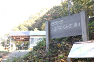 「いなぎめぐみの里山」の看板を左に入った先の小屋が里山の受付です。