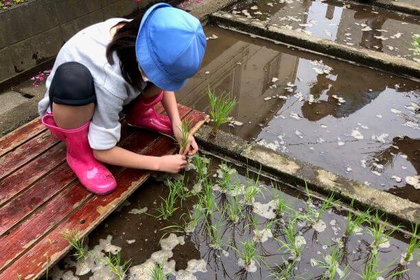 ミニ田んぼの場合も、植える時の深さは人差し指の第2関節(約5㎝)くらいが目安です。