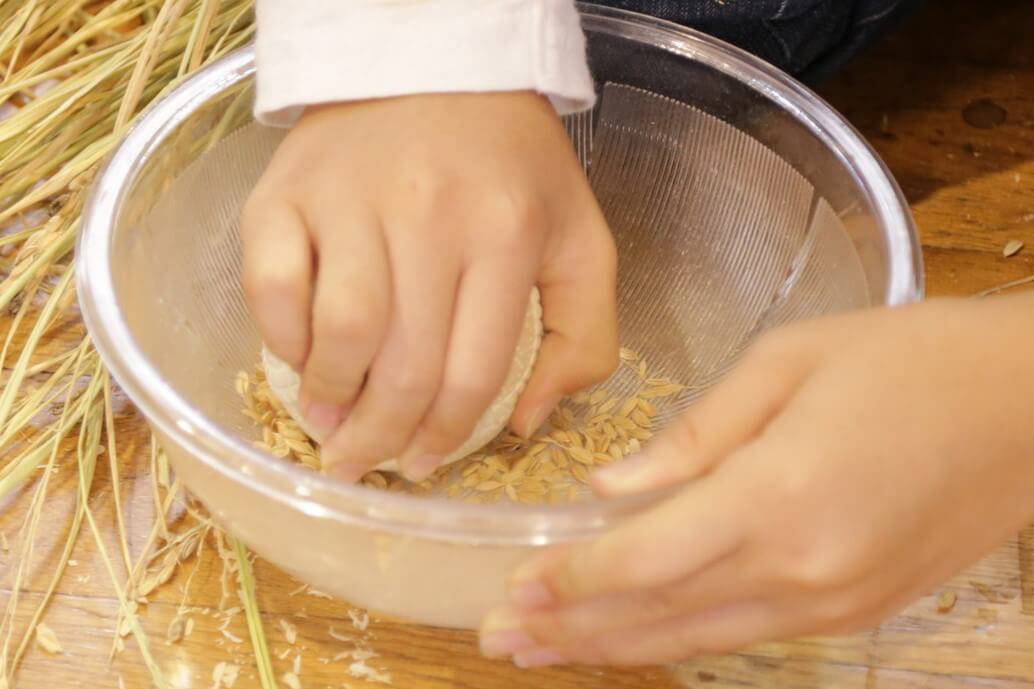 脱穀(だっこく)した籾(もみ)の籾殻(もみがら)を取り除くことを「籾摺り(もみすり)」といいます。脱穀した籾(もみ)をすちばちに入れて、野球ボールなどでゆっくりとこすりましょう。