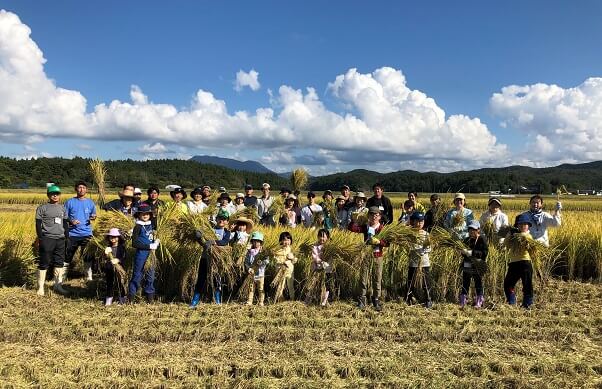 黄金色の稲穂が実る田んぼで稲刈り体験、絶景の夕陽を拝んだら、活気あふれる生産者との夕食交流会。