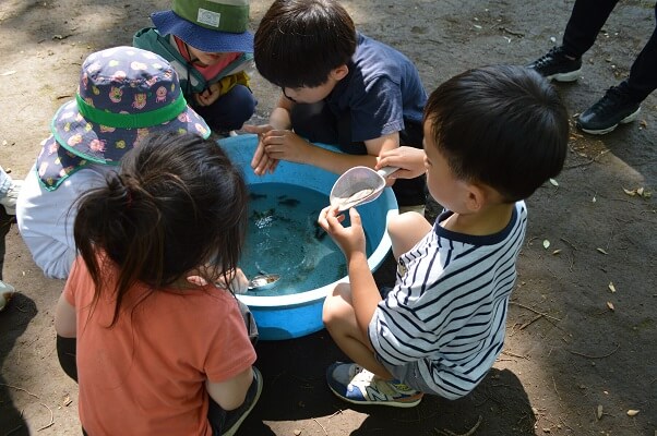 地域の人が捕まえ届けてくれた小魚やザリガニ。 みんな夢中!