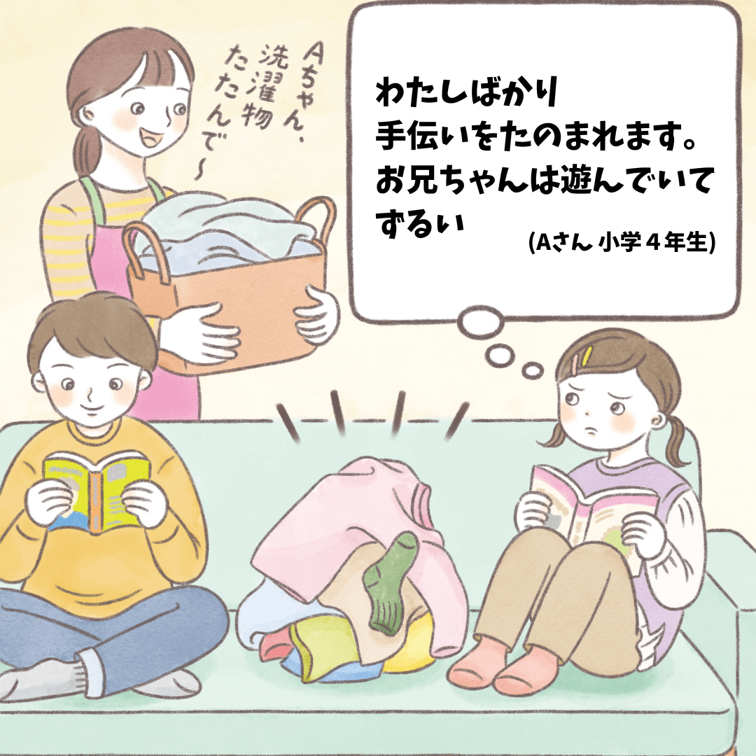 「洗濯ものたたんで」「ごはんの用意、手伝って」など、おかあさんから手伝いをたのまれることが多いAさん。2つ年上のお兄さんはあまりたのまれないので、ずるいと感じてしまうのだそうです。