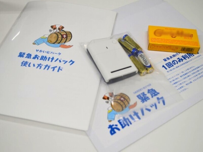 1泊分宿泊チケット、1食分の非常食、自身の携帯電話で相談機関に連絡するための充電器やガイドなどが入った「緊急お助けパック」。