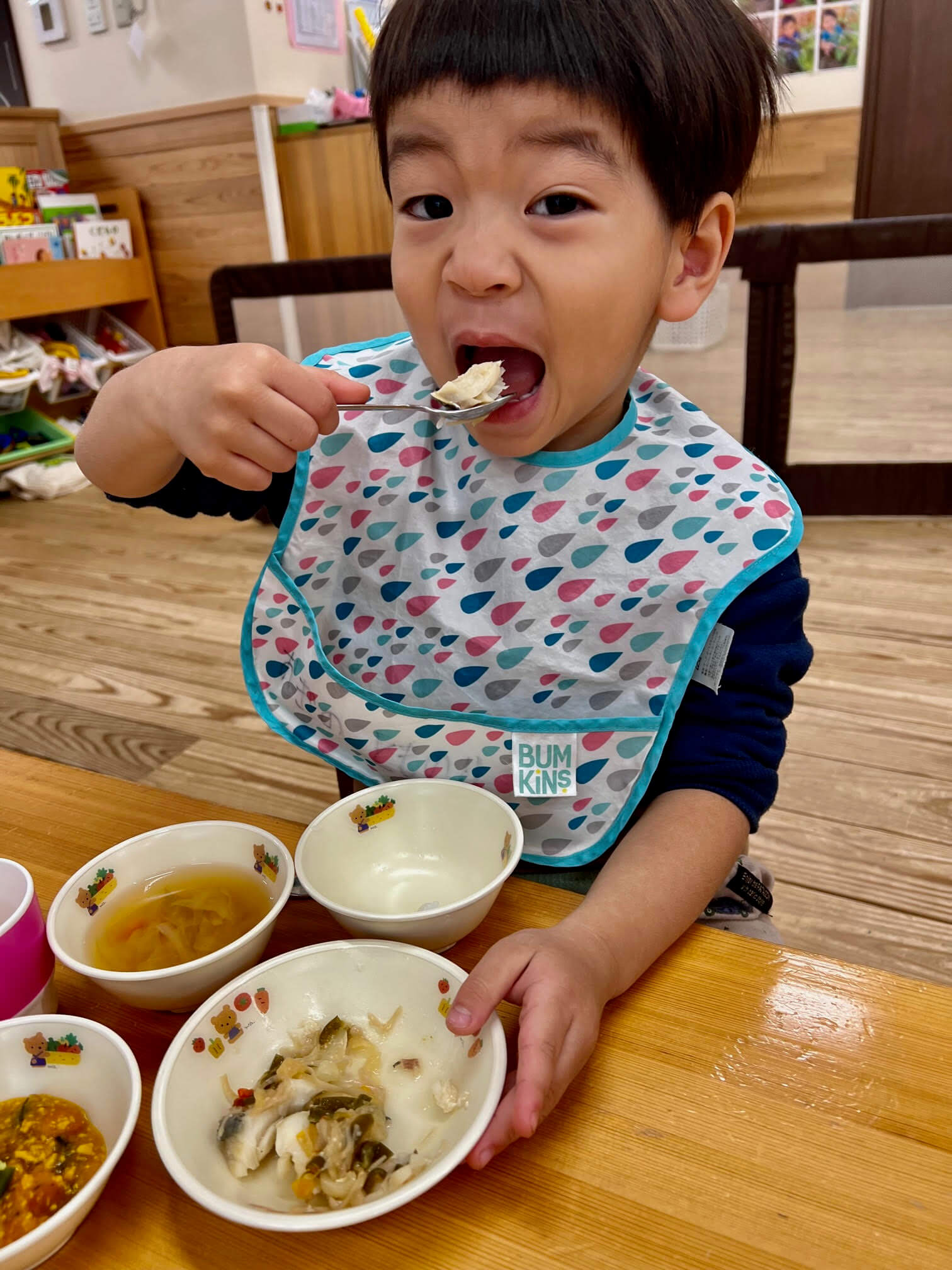 0歳児さんは手づかみで「パクっ!」1・2歳児さんはスプーンを使って大きな口で「あ~ん、パクっ」幼児さんは切り身をフォークでダイナミックに「あぁ~ぐっ、もぐもぐ♪」