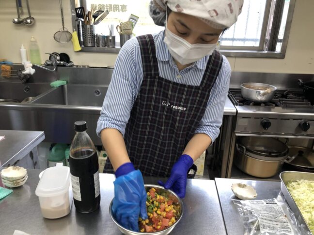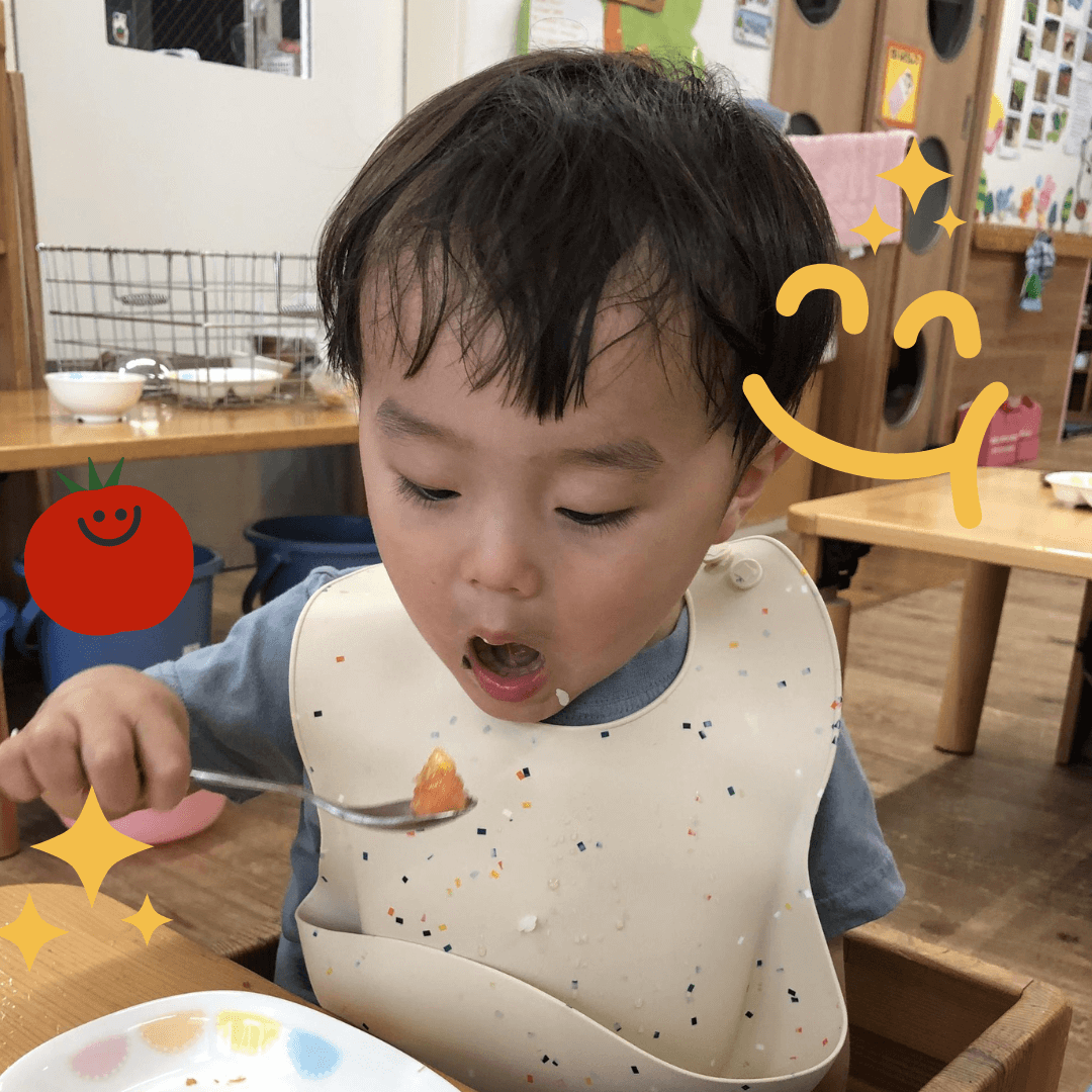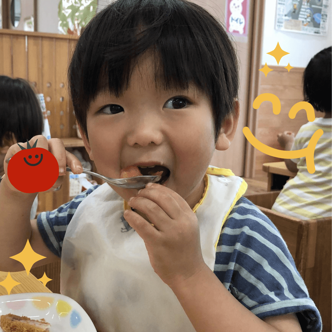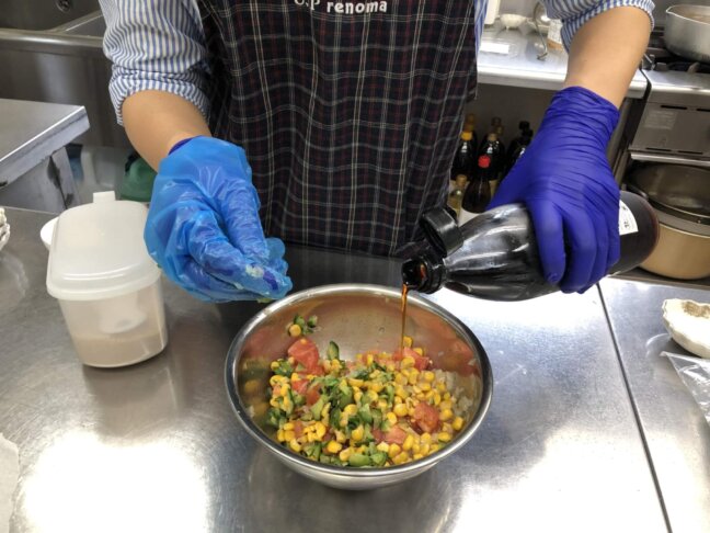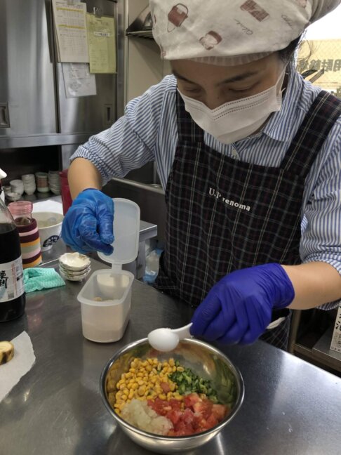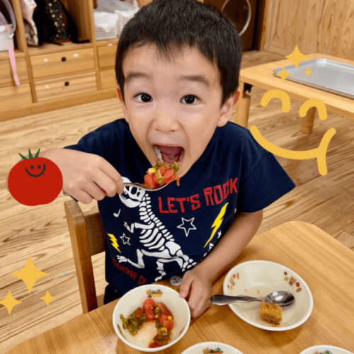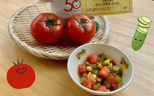真っ赤なトマトをメインに、コーンの黄色、きゅうりの緑を加え、見た目の色合いも楽しめる、園でも人気のメニュー。野菜本来の甘みを引き出すために、味つけは「めんつゆ」+「砂糖」のみであえてシンプルに。