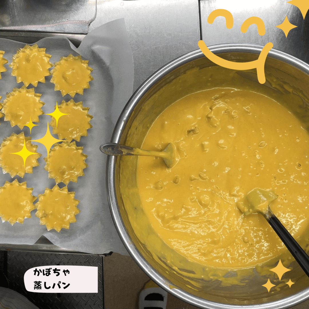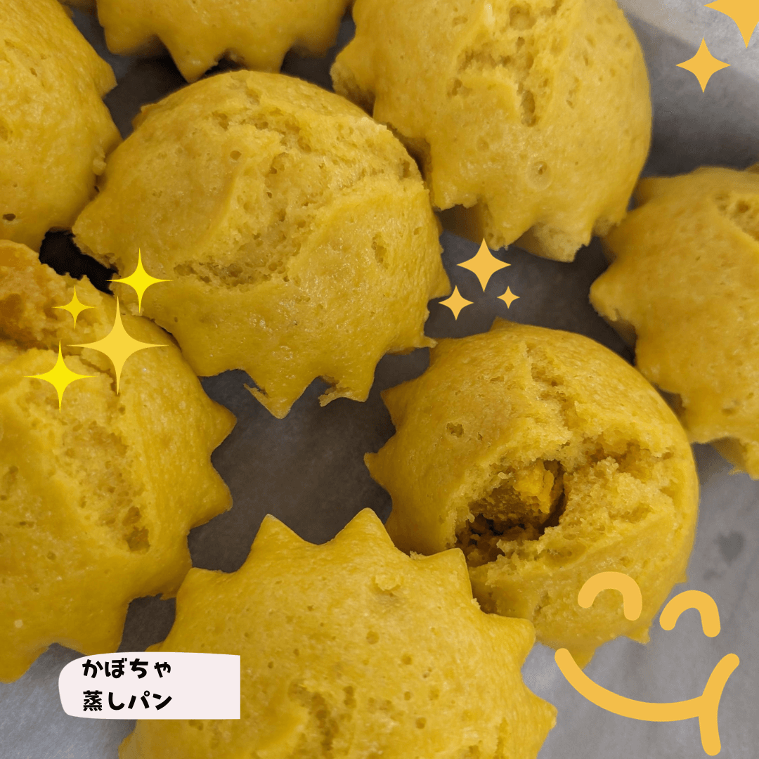 | かぼちゃ蒸しパン | 材料(約15個) 産直小麦のホットケーキミックス 1袋(200g) 卵 1個 花見糖 14g 牛乳 120g yumyum産直うらごしかぼちゃ 5個(1個22g) 菜種油 20g 北海道冷凍栗かぼちゃ(混ぜ込み用) 100g |