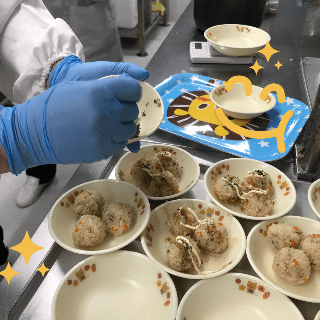 | たこ焼き風おにぎり(直径3㎝丸型約30個分) | 米 3合 豚ひき肉 75g にんじん 45g 青ネギ 15g 調味料 Aしょうゆ 小さじ1と1/2 Aみりん 小さじ1と1/2 A酒 小さじ1と1/2 A砂糖 小さじ1と1/2 ソース 適量 マヨネーズ 適量 かつお節 適量 青のり 適量 |