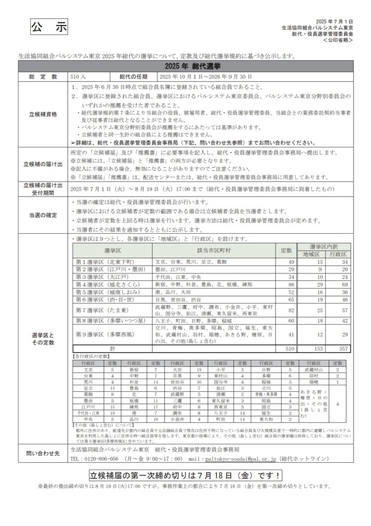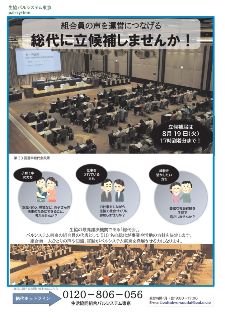 パルシステム東京では、多様な総代の立候補をお待ちしています。詳しくは以下の「2025年総代選挙公示」をご覧ください。