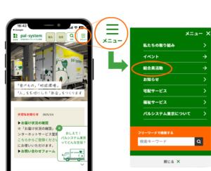 スマートフォンから閲覧するときは、TOPページのメニューアイコンをタップ