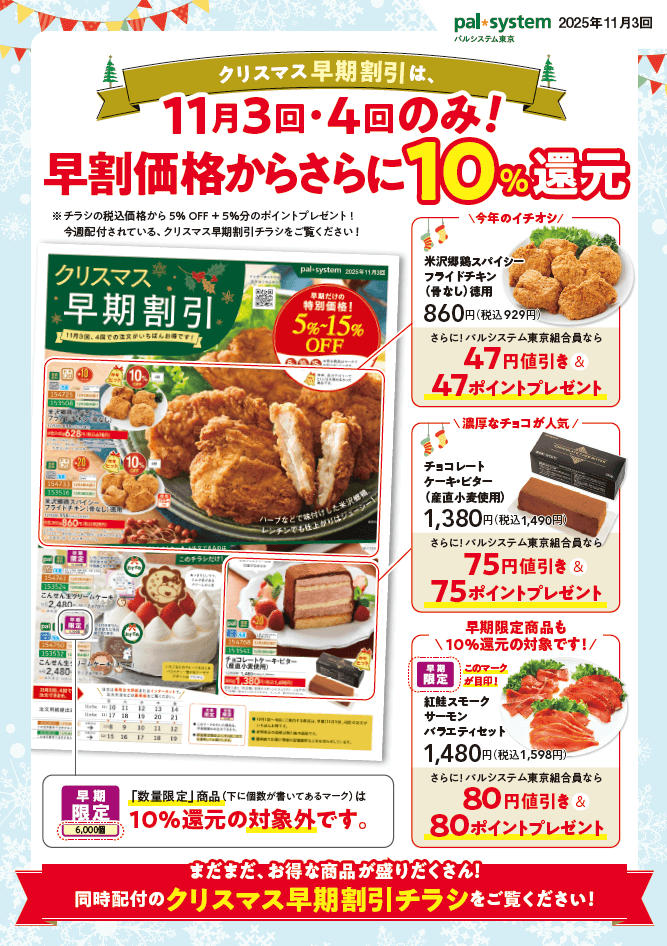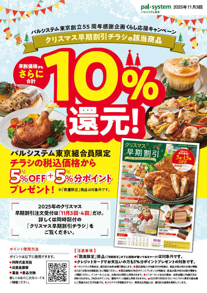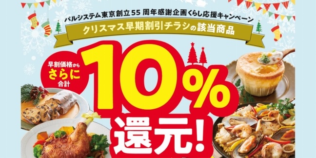 毎年ご好評いただいているクリスマス早期割引に合わせて、パルシステム東京組合員限定の「くらし応援キャンペーン(10%還元企画)」を実施します!