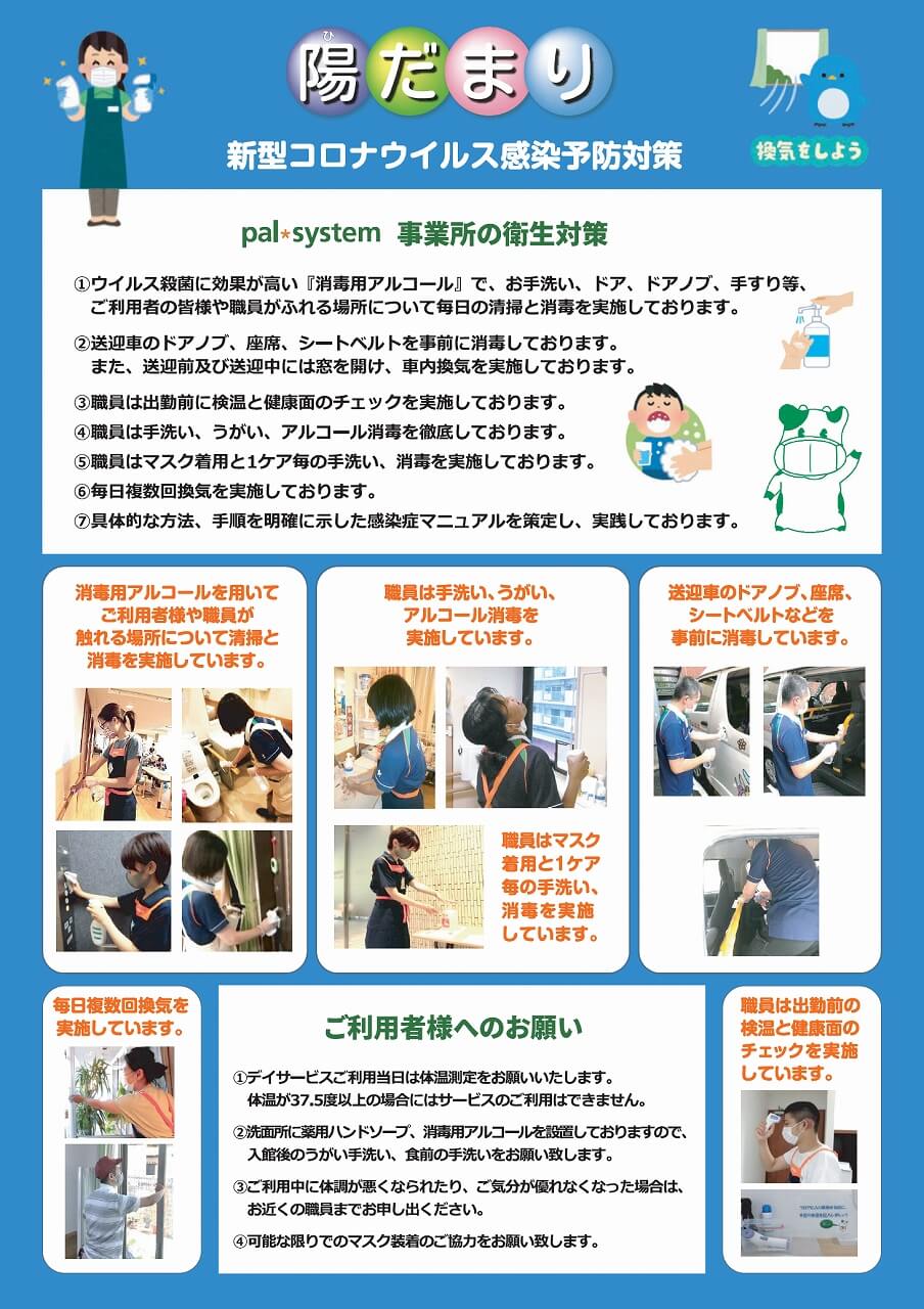 「陽だまり」各事業所では、新型コロナウイルス感染予防の観点から、下記ポスターにも記載の通り、毎日の清掃・消毒、換気、検温やマスク着用等の衛生対策を実施しております。