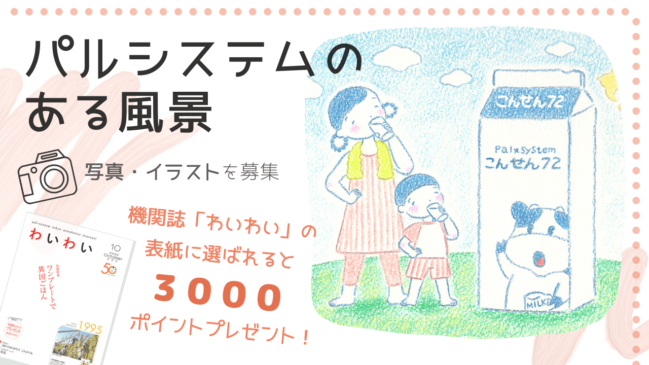 あなたが思う「パルシステムのある風景」の写真やイラストを募集します。パルシステムの商品をおいしそうに食べる家族、街で見かけるこんせんくんトラックなど、エピソードといっしょにお寄せください。ご応募いただいた中から、12作品は機関誌「わいわい」の表紙を飾ります!