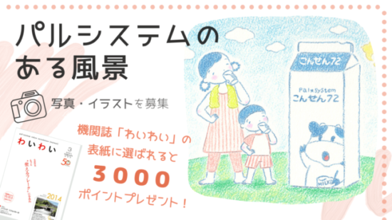 パルシステム東京では「パルシステムのある風景」の写真やイラストを通年で募集しています。日常の何気ないワンシーンや絵の得意なお子様が描いたイラストなど、エピソードといっしょにお寄せください。ご応募いただいた中から、毎月1作品が機関誌「わいわい」の表紙を飾ります!