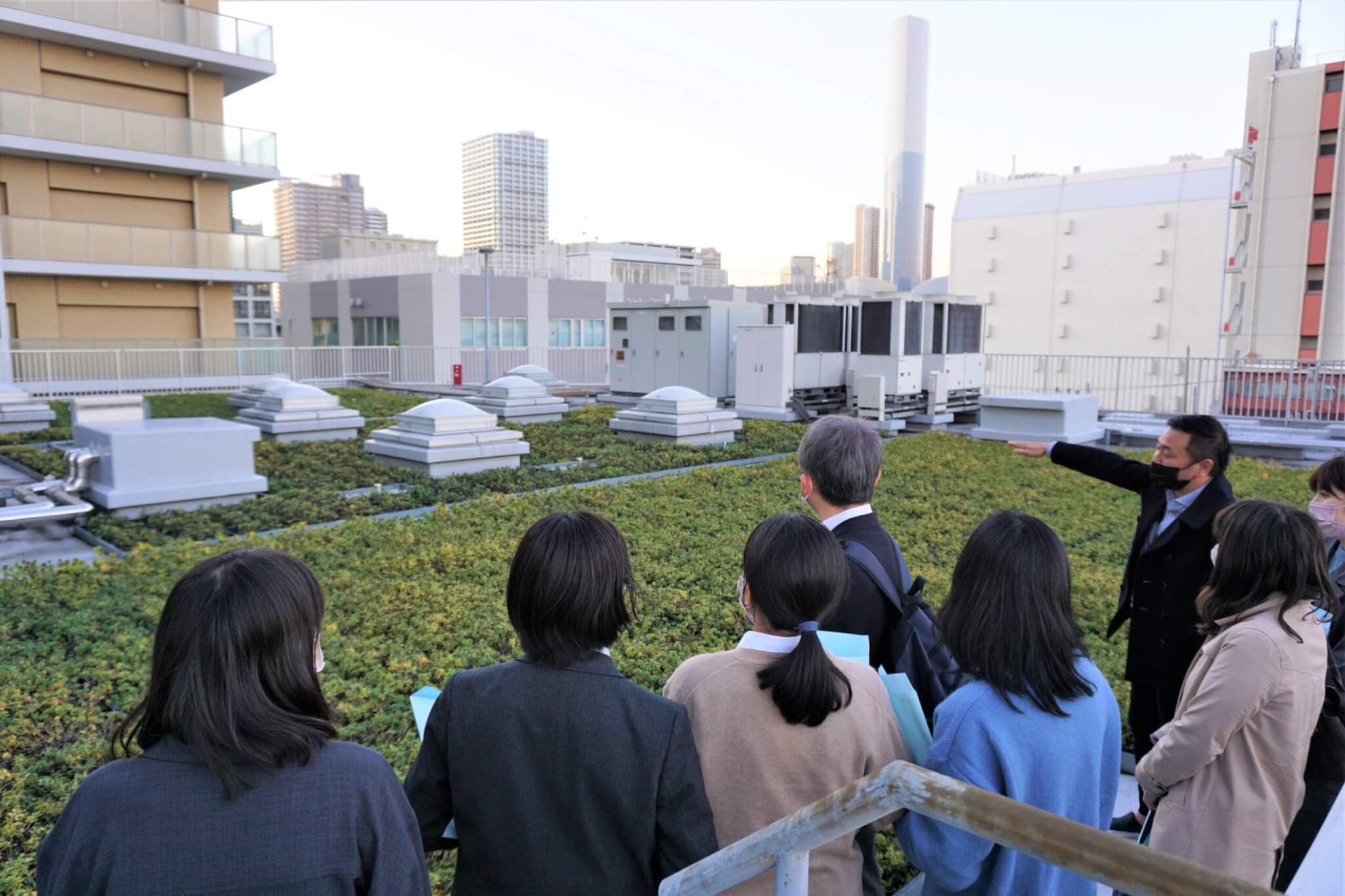断熱に効果を発揮し、空調効率のアップに役立つ「屋上緑化」見学のようす
