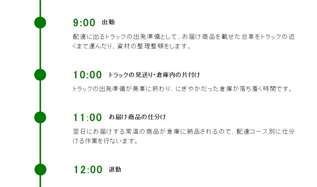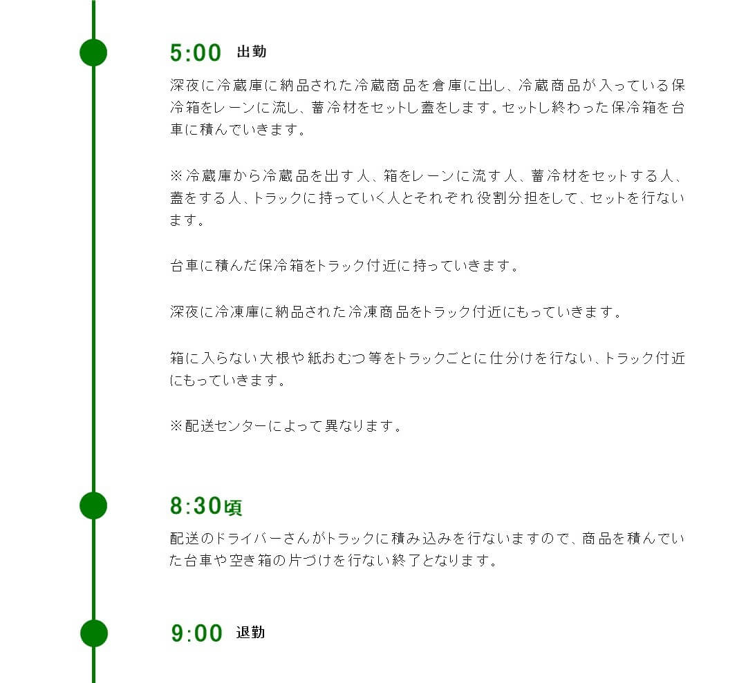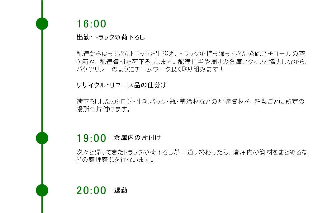 パルシステム東京の倉庫スタッフ(早朝、日中、夕方)の「一日の仕事の流れ」を紹介します。