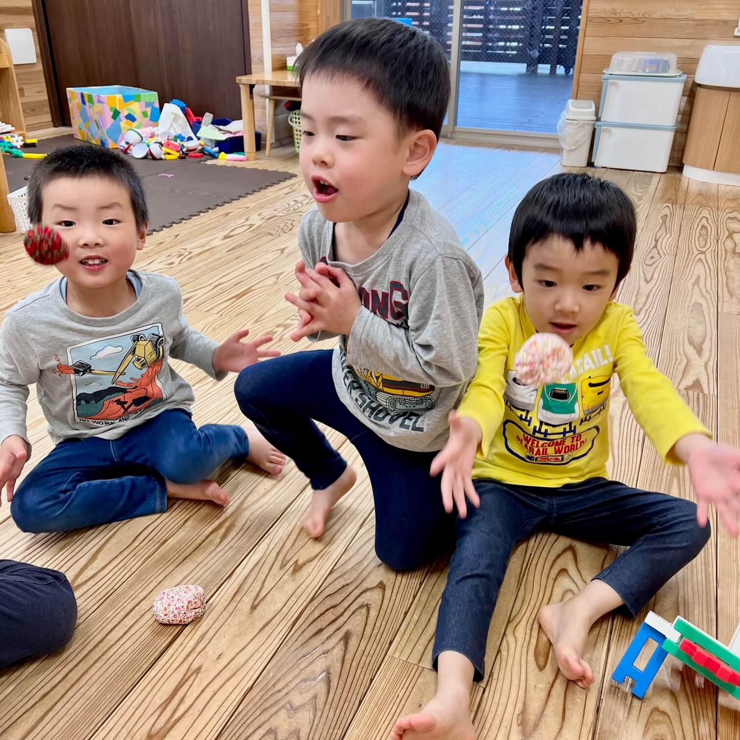 1月にお正月あそびと伝承あそびを行った子どもたち、お手玉の遊び方もバッチリ