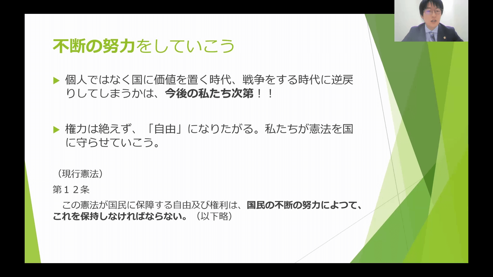 ◆憲法について、分かっているようで全く理解していなかった自分を恥ずかしく思います。また、不断の努力で国民全員が国家を牽制し、独裁政治にならない様にしていかなければならない、そのために出来ることを今日からしていきたい。