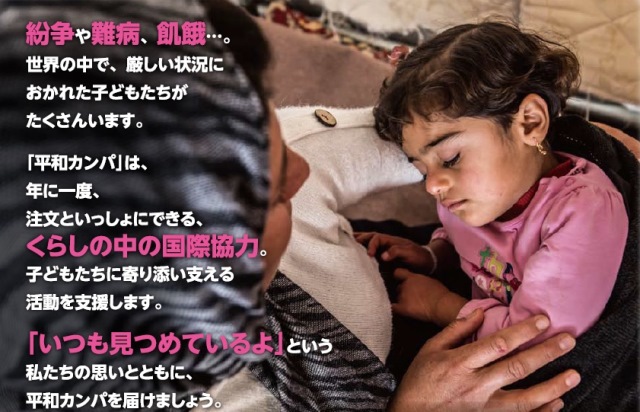 紛争や難病、飢餓…世界の厳しい状況の子どもたちへの支援を目的として、1996年から毎年取り組んでいる平和カンパ。カンパ金は、国際協力NGOなどの団体に贈呈し、世界の子ども達の支援に活用されています。
