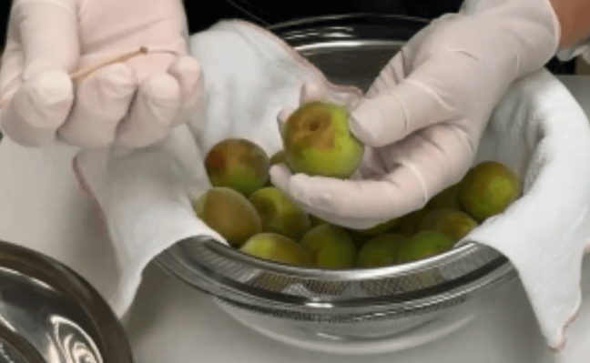 一晩水に漬けた青梅をふきんでひと粒ずつ水けをふいて、竹串やようじでへた(なり口)をとります。そして、保存びんに入れる際は、梅と花見糖を交互に重ね入れます。最後は砂糖で終わるように重ね入れることがポイント!冷暗所に3~7日間ほどおき、砂糖が溶けると飲み頃です。