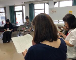 グループでテーブル席に移り、「一人ひとりの音読を耳と気持ちを澄ませて聴くこと」などをお伝えしてから、用意した5編の素材を、不明な点がないか確かめながら一緒に声を出して読みました。