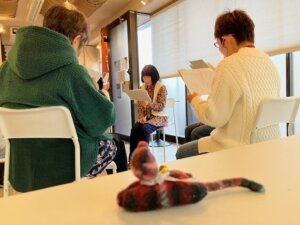 休憩時間はフリーなおしゃべりや、素材の原本を手に取ったり。そしてサークル席に戻って、いよいよ一人ずつの音読…のつもりでしたが初めは緊張するので、輪読からスタートしました。声を出し耳を傾けることで少し緩んだ雰囲気の中、一人ずつの音読となりました。