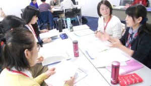 いよいよ本日のメイン。自分が企画したワークショップの内容をさらに深めるために、グループに分かれてお互いに聴き合うワーク。机を動かして3つの島を作りそれぞれに分かれて開始。皆さん積極的に質問をしたり、熱心に聴いたりしていました。 質問されることで、あいまいなところが明確になったり、テーマの絞り方や対象者についての考え方など、課題もみえてきて、企画内容をさらに具体的にできたようです。質問がだれかに集中したり、一人の人が多くしゃべる場面もありましたが、途中脱線してしまった話を軌道修正するなど、グループワークの進め方も学べたようでした。