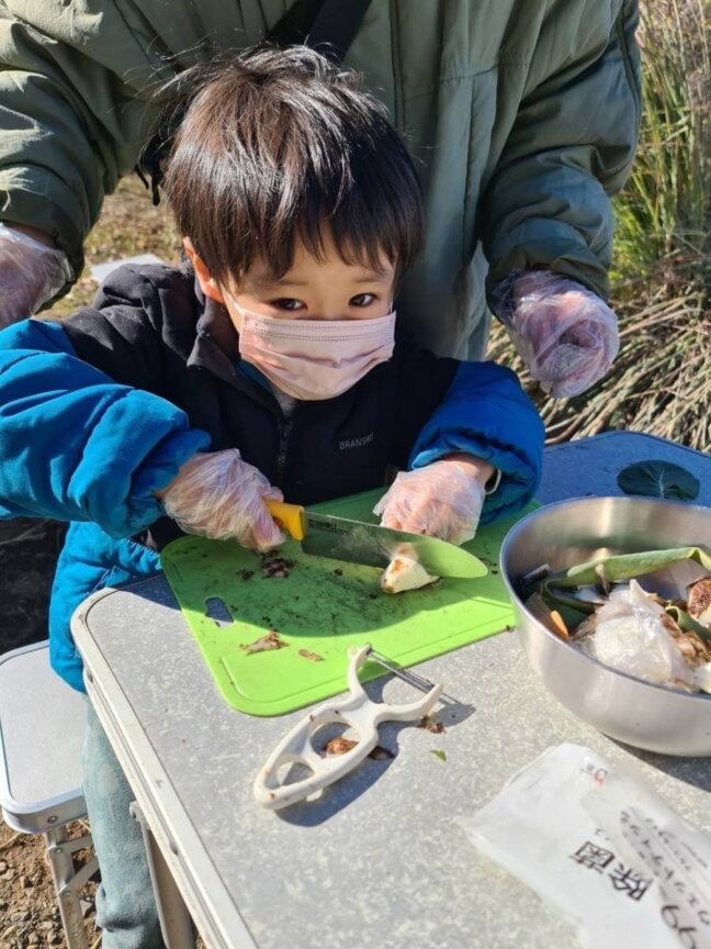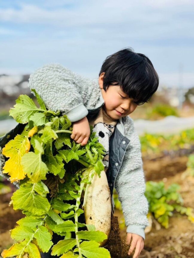 「家でこどもに料理を教えることが難しいため(親の忍耐力、子どもの集中力がもたない)、イベント的に他のご家族と一緒に野菜を切って作る経験ができてよかったです。また、お雑煮作りだけでなく、野菜の収穫とそれをそのまま購入できるのも良い食育に繋がりました。普段、あまり野菜を食べたがらない子どもが自分が収穫した野菜は、家でもしっかり食べていました。」