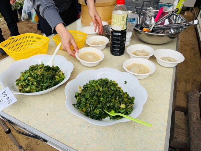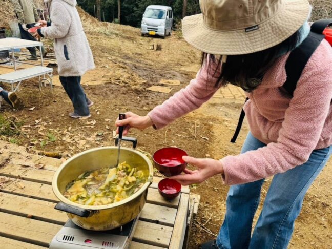里山でとれた野菜とお餅を使って、みんなでお雑煮を作りました。たくさん食べた後は、里山を散策し、いろいろな体験を楽しみました。