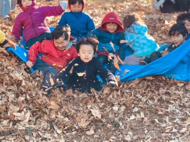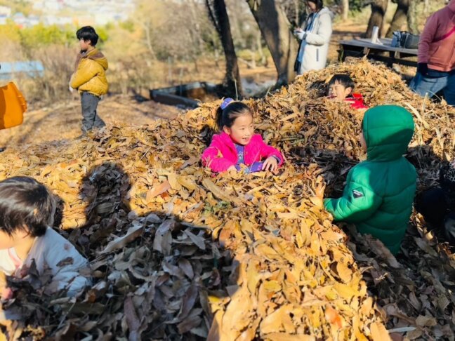 里山の落ち葉を集めて作る「落ち葉のプール」!落ち葉に埋もれたり、そりに乗って落ち葉の山を滑り降りたりして遊んだ後は、ほくほくの焼き芋をいただきました。