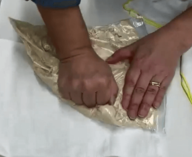 ①画像(左)のようにラップを指の第2関節くらいまで押し込み土手を作ります。
