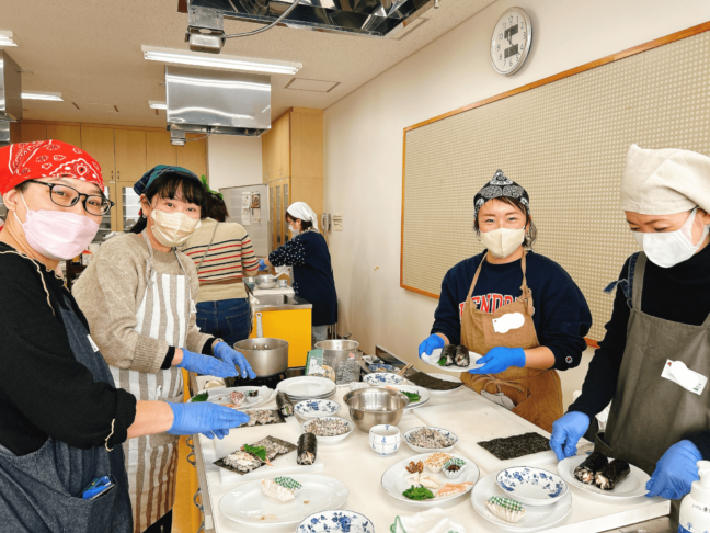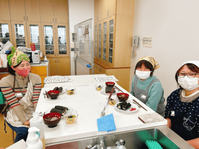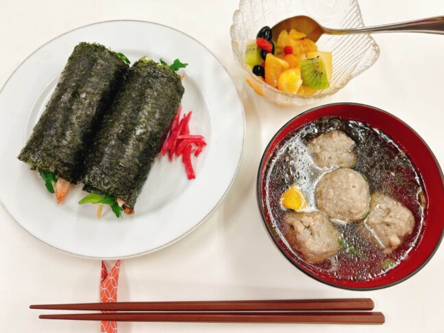 薬膳とは何?という身近なところから、簡単に置き換えができる食材を紹介するなど、薬膳初心者向けの講座を行った後、①ミニ恵方巻(薬膳風)②産直もずくのスープ③福豆デザートの3品を作りました。