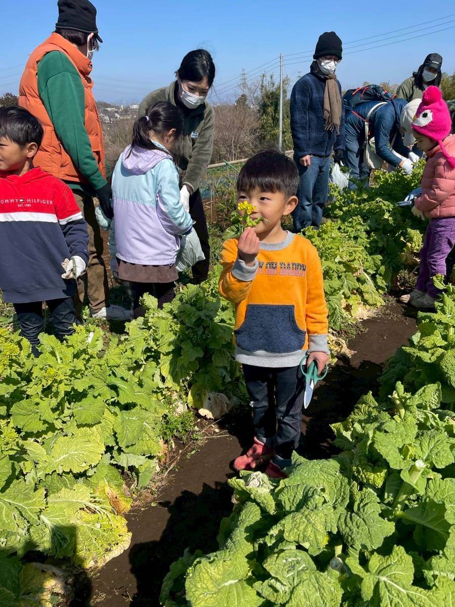 のらぼう菜とは、柔らかく栄養価が高い、多摩地域特産の春野菜です。収穫体験と里山散策で、太陽を感じながら春の里山を楽しみました。