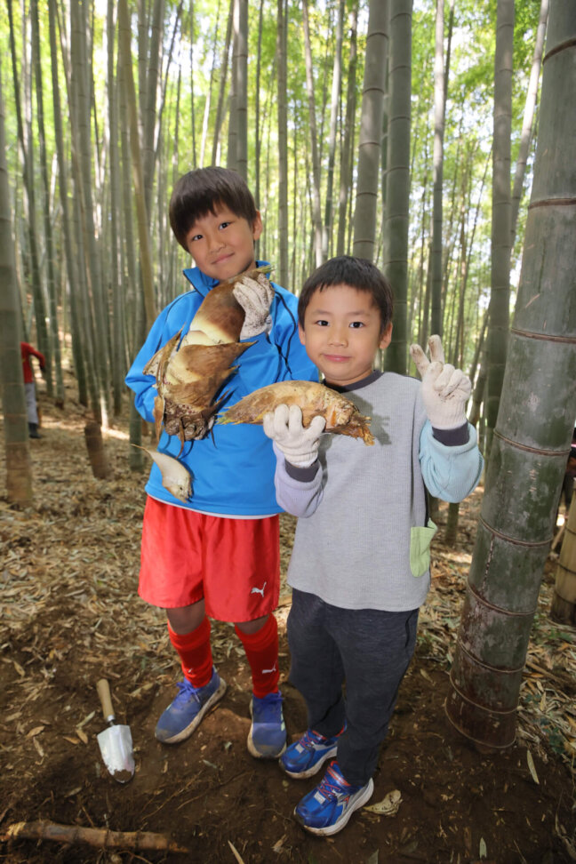 毎年大人気のタケノコ掘り企画。竹林の中でタケノコを探し、スコップで掘り起こしました!