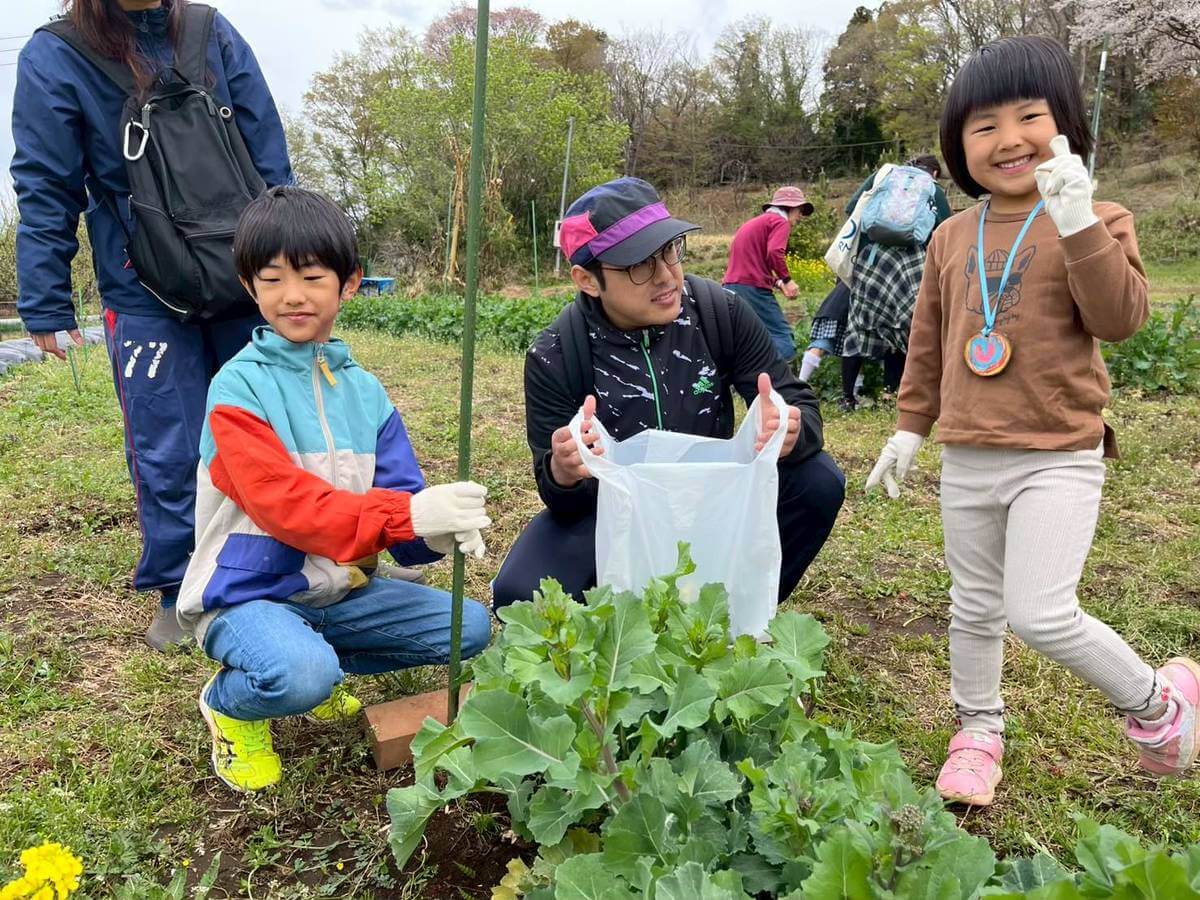 春の里山をガイド付きで散策。竹林や雑木林のなかでリフレッシュした後、里山の竹で工作づくりや、畑の春野菜の収穫をしました。