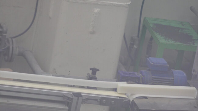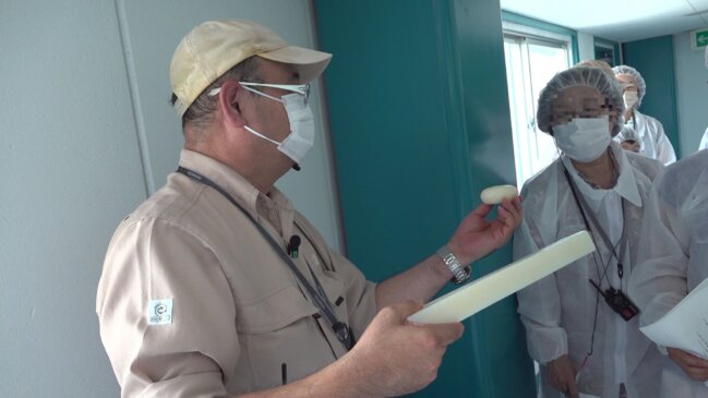 押し出し機からでてきた石けんバーの大きさに驚きました。出来たての石けんバーは温かく、手で曲げられると話されていました。