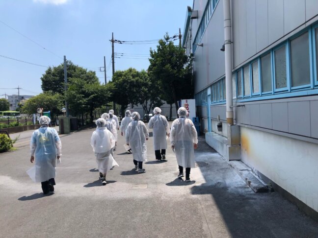お話を聞いた後は2チームに分かれて、帽子と白衣を身に着けて工場見学に出発します!