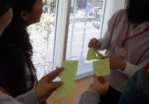 プレゼンテーションを聞いて、感じたこと、思ったことを付箋に書いて、発表者へ伝えます。いつも仲間で切磋琢磨。 食の安心安全を求めて生協へ加入した人も、「日々の暮らし課題を抱えたそのままのあなたで来てください!」を伝えたい、「この企画は私のためにある?」と読み手の思いを代弁するようなタイトル文、リード文を作る。語れる場を作る。それが私たちの役割。子育て個育てワークショップの場を開催する意義を改めて確認しました。