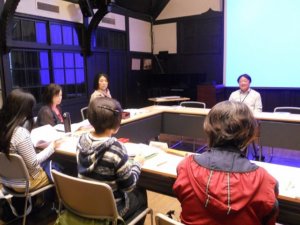 築90年の会場では杉浦学芸員が「賀川豊彦の協同組合思想と実践」についてビデオ上映を織り交ぜて話しました。後半にはファシリテーターがその話を聞いて問いを上げていきました。中級講座第5回の課題が、《問いを磨く》の実践で、賀川豊彦の妻の生き方まで多岐にわたりました。