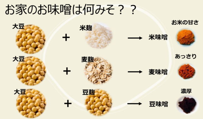 みその種類は大きく分け3種類あります。米麴、麦麴、豆麴を使ったみそがあります。
