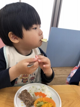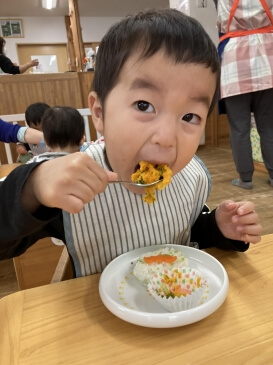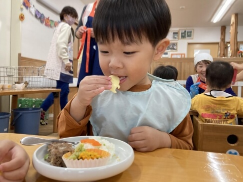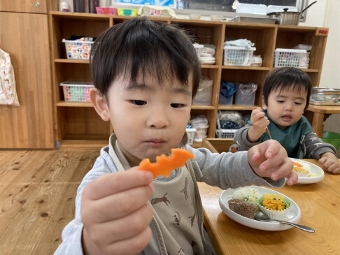 おばけのチーズ乗せハンバーグや、コウモリ型の人参に歓声があがり、かぼちゃサラダは飛ぶように売れていました♪